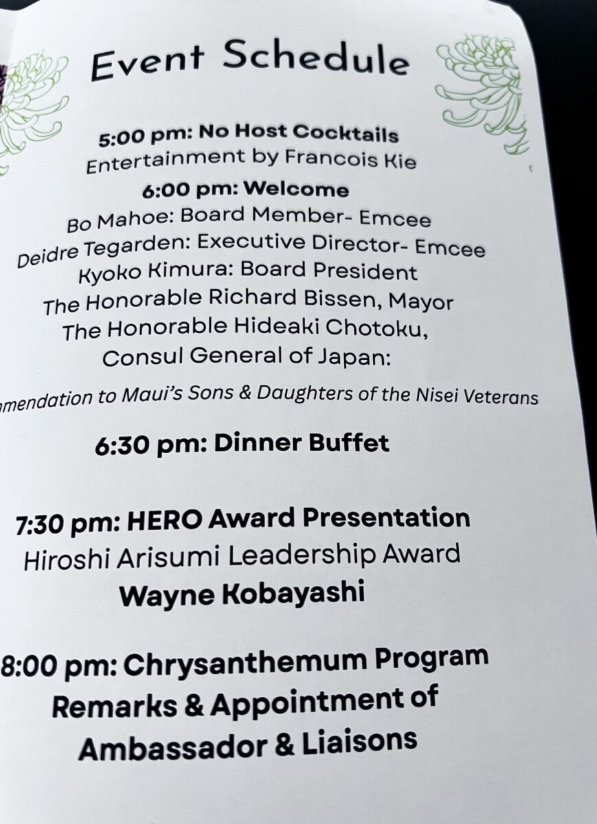 2026年4月24日(金)午後5時~午後9時にマウイビーチホテルにて開催された「Chrysanthemum Gala」では、以下のようなことが行われました。