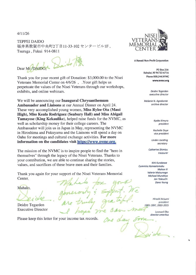 二世退役軍人たちは、ハワイでの地域社会において特別な存在です。祖国から忠誠心を疑われる中でも、彼らは自発的に国に奉仕することを選びました。そして、遠く離れたヨーロッパや太平洋の戦場でその忠誠心を証明し、その規模と従軍期間において、米陸軍史上最も多くの勲章を受けた部隊となりました。